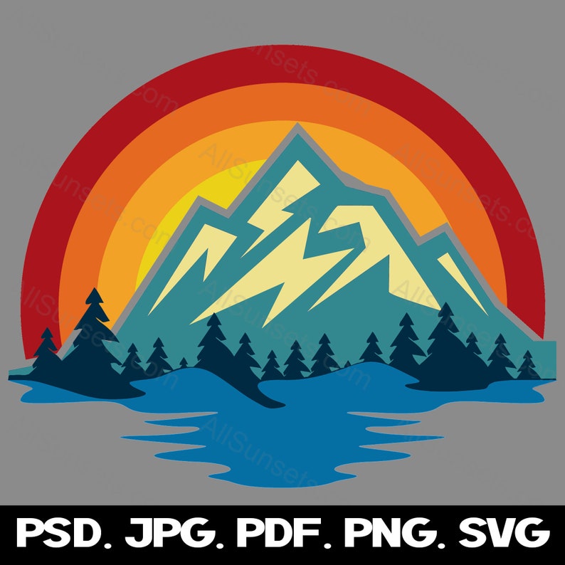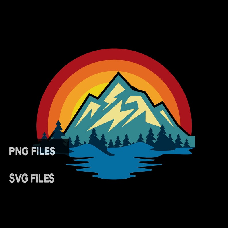 Mountain Lake Retro Sunset Svg, Mountains And Trees Svg